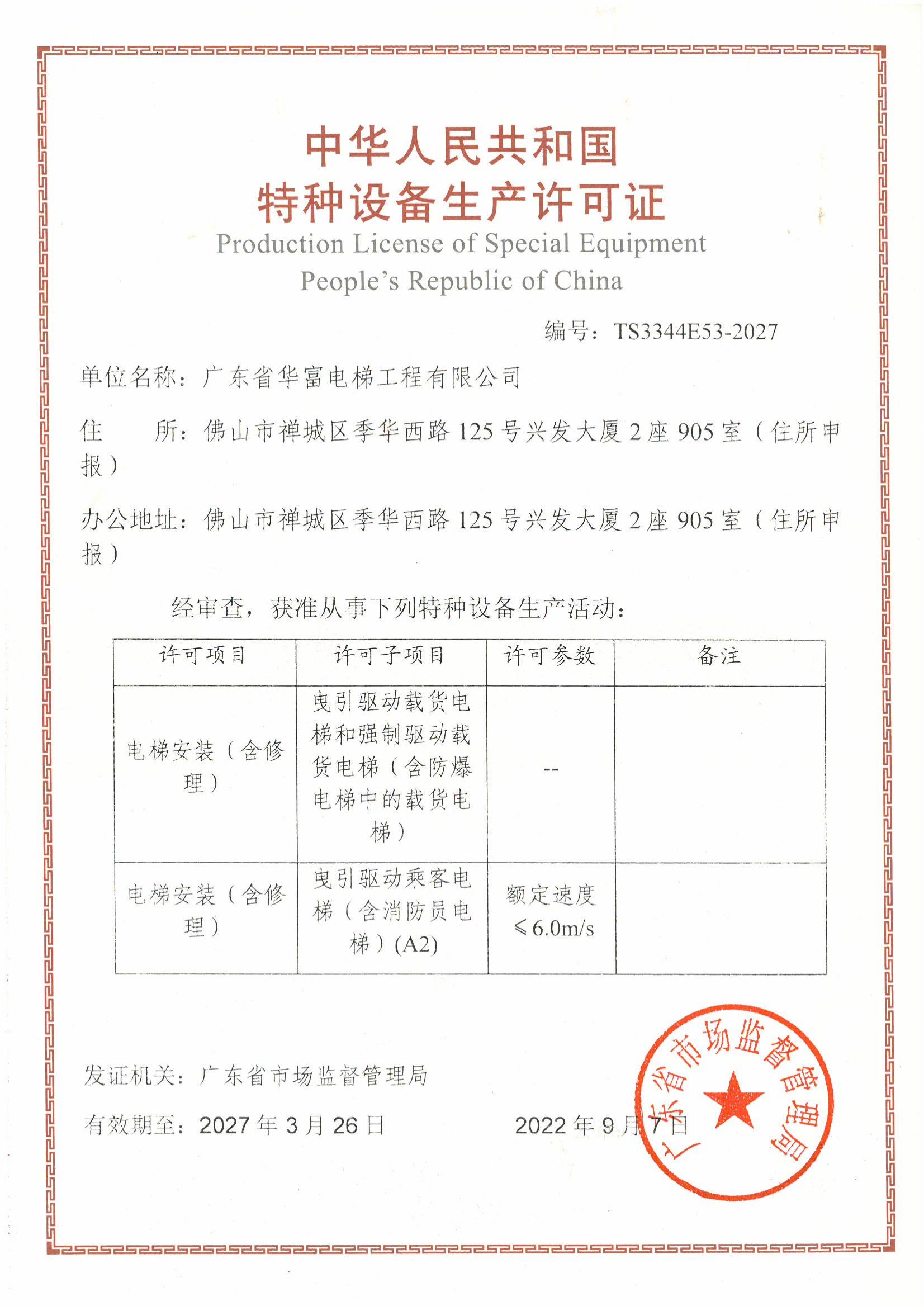 下一篇:廣東省華富電梯工程有限公司特種設(shè)備生產(chǎn)許可證